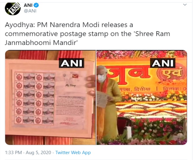अयोध्या राम मंदिर भूमि पूजन (Ayodhya Ram Mandir Bhumi Pujan) के दौरान प्रधानमंत्री नरेंद्र मोदी ने ‘श्री राम जन्मभूमि मंदिर’ का डाक टिकट भी जारी किया है। यादगार के तौर पर जारी किया गया ये डाक टिकट राम जन्मभूमि मंदिर के मौजूदा मॉडल पर बनाया गया है। इससे पहले भी प्रधानमंत्री मोदी भगवान श्री राम पर 11 स्मारक डाक टिकट जारी कर चुके हैं।