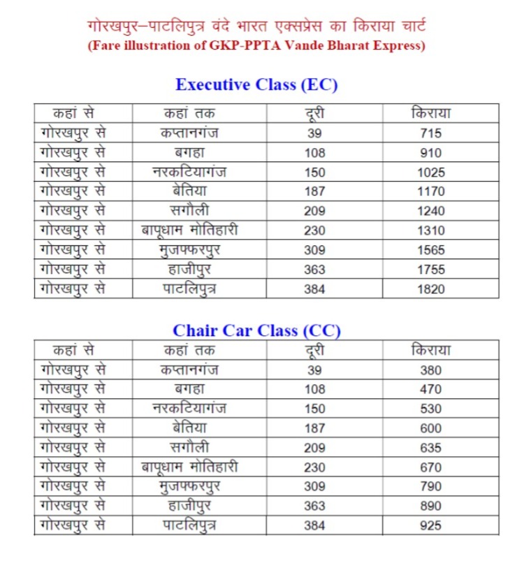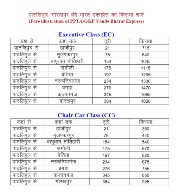 बिहार और उत्तर प्रदेश के लाखों रेल यात्रियों के लिए एक बड़ी सौगात आने वाली है। यात्रियों की सुविधाओं को ध्यान में रखते हुए पाटलिपुत्र और गोरखपुर के बीच अत्याधुनिक एवं विश्वस्तरीय सुविधाओं से लैस सेमी हाई स्पीड वंदे भारत एक्सप्रेस ट्रेन का संचालन प्रारंभ किया जा रहा है। यह ट्रेन हाजीपुर, मुजफ्फरपुर, बापूधाम मोतिहारी, नरकटियागंज, बगहा और कप्तानगंज जैसे प्रमुख स्टेशनों से होकर गुजरेगी।